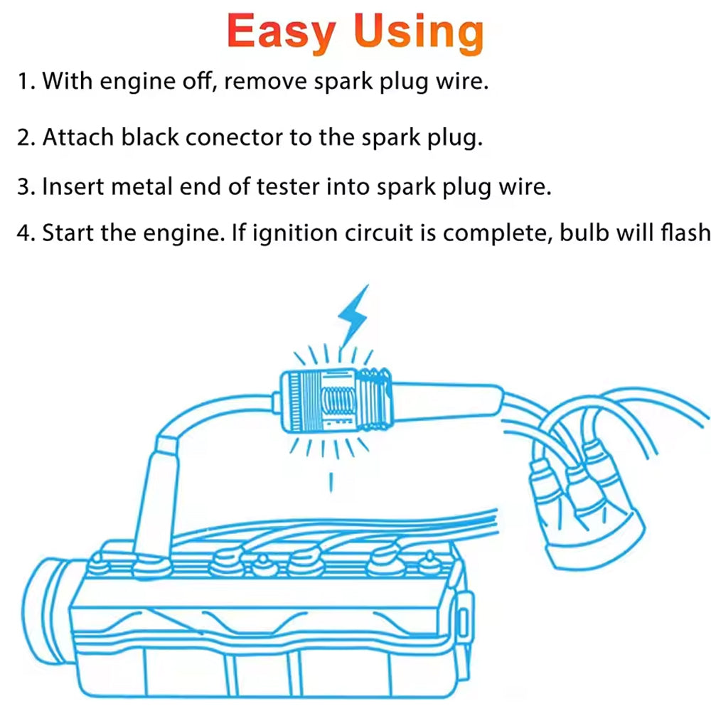 *How to Use: Connect the black skin of the tester to the spark plug and the metal end of the tester to the spark plug coil. After starting the engine, if the ignition circuit has been completed, spark tester automotive light will flash