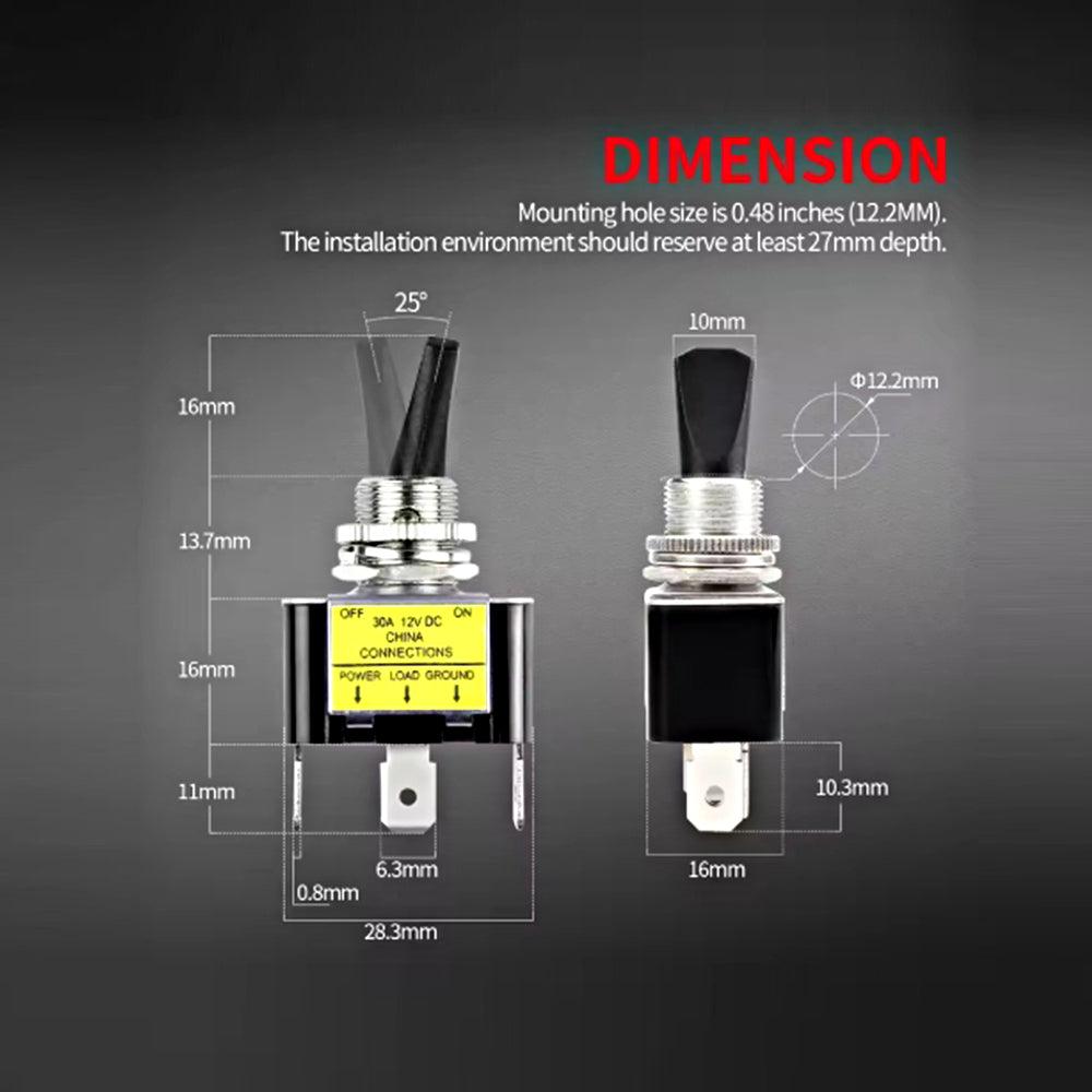 - Size: 12V toggle switch Overall size is 28.3*16*56 MM.