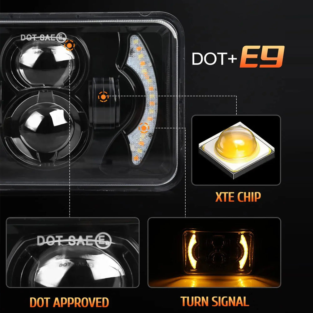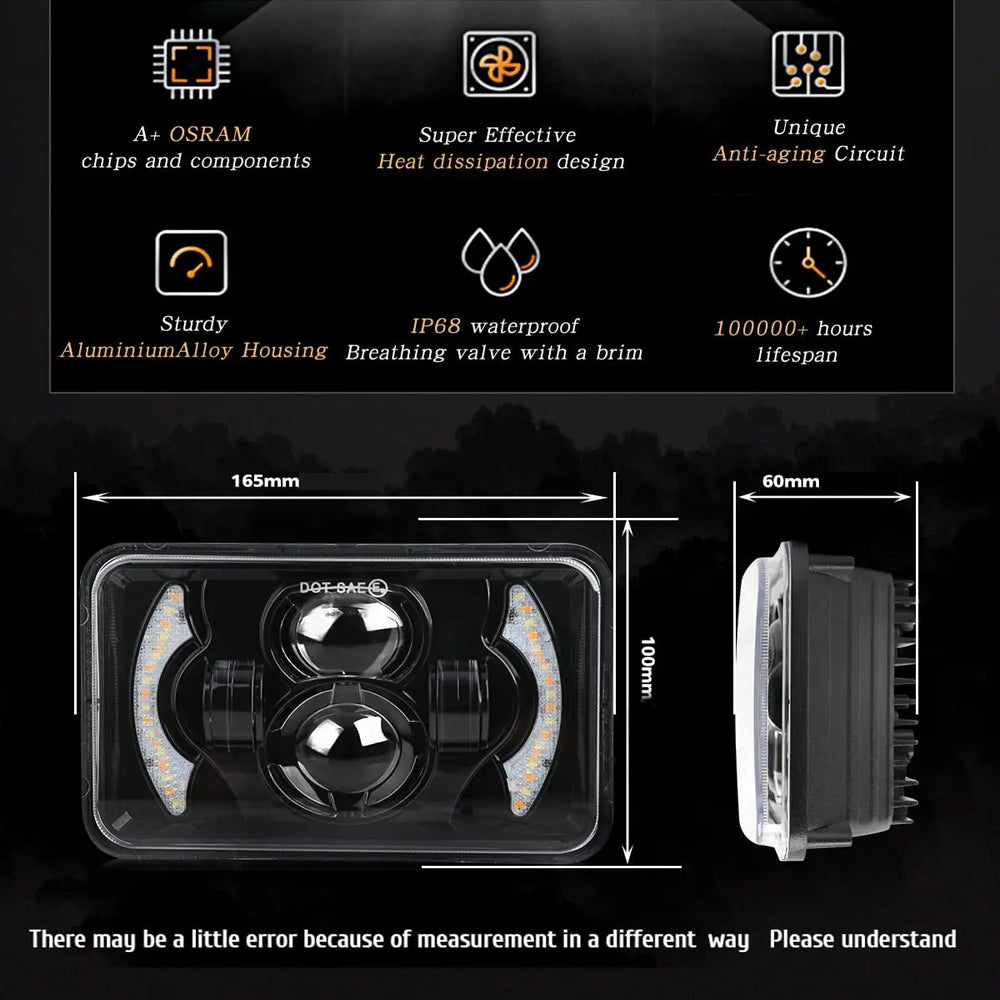 LED headlights for vehicles with 100x165 mm sealed beam type headlights. Four pattern (High beam & Low beam & Daytime Running Light &Turn Single) High beam is 4500lm, low beam is 3000lm, angel eye 1000lm.