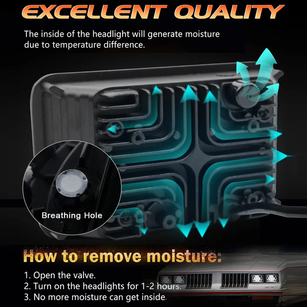 The led headlights are constructed of die-cast aluminum and features a polycarbonate lens with IP68 waterproof protection. The back of the headlights supports a breathable design for robust air flow. This component prevents the lamp from fogging up in harsh environments.