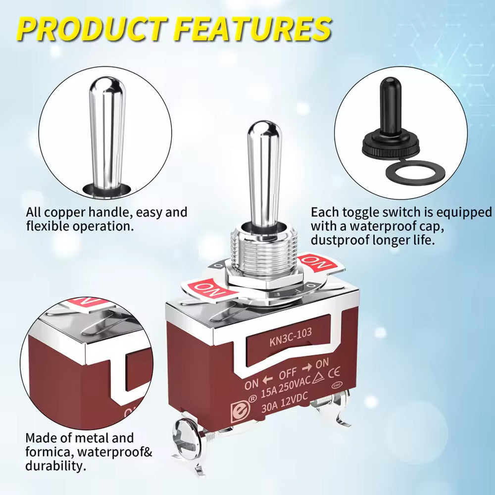 Rating: 30A 12V DC, 15A 250V AC, heavy duty toggle switch 12v design