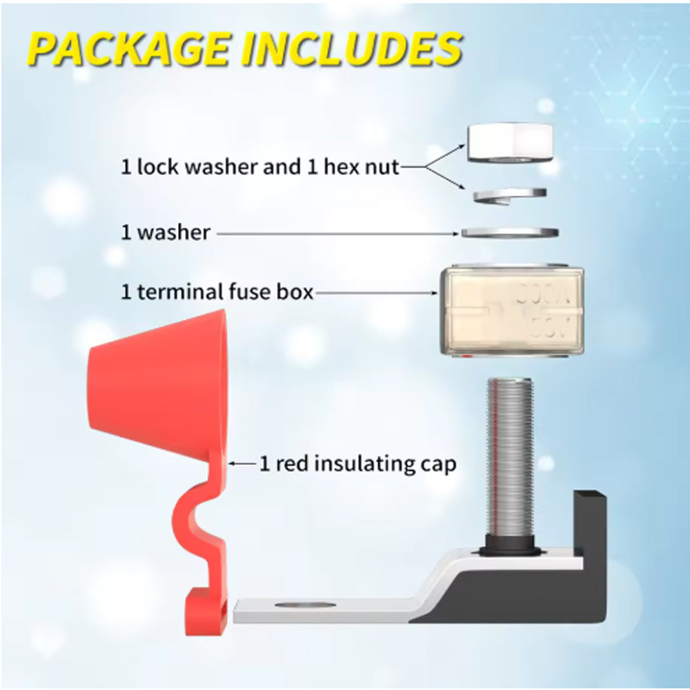 - What You Get: Package includes 1 terminal fuse box, 1 red insulating cap, 1 washer, 1 lock washer and 1 hex nut.