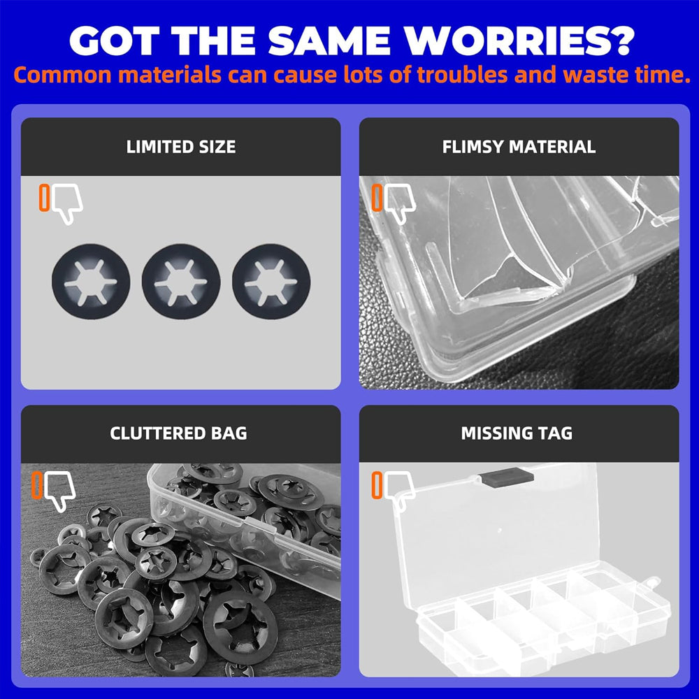 *Convenient Storage: Manganese steel star washers are assorted in a transparent, compartmentalized box with labeled sections for organized storage and quick size selection