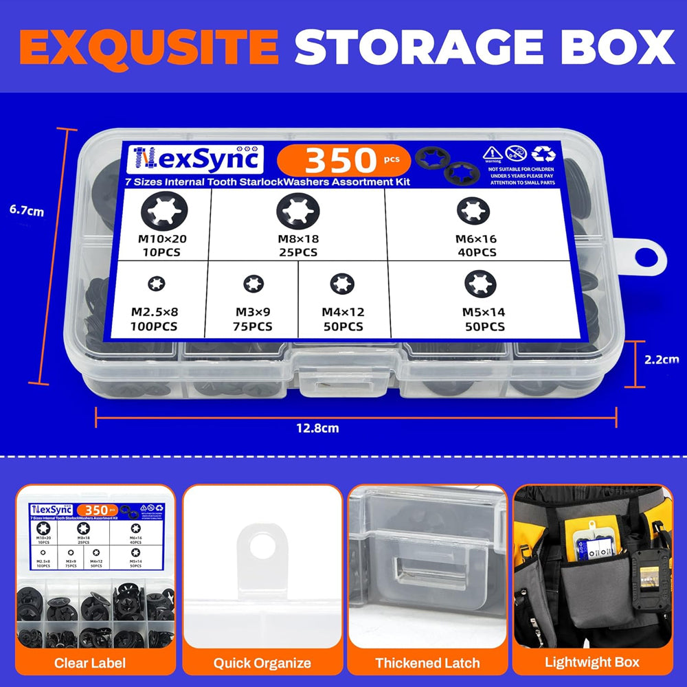 *Star Washer Sizes: 350 Internal tooth starlock washers (M2.5/M3/M4/M5/M6/M8/M10) in a clear plastic case provide versatile sizing and ample quantity for daily projects