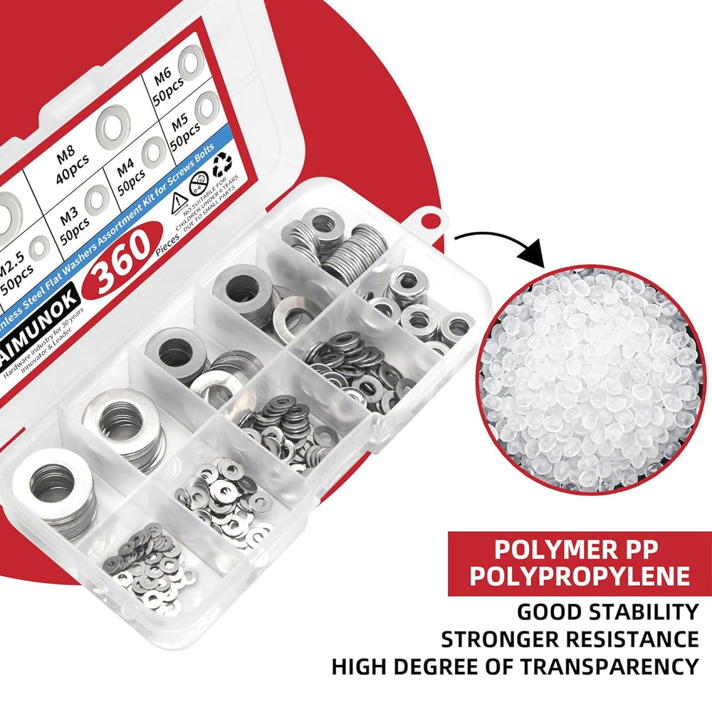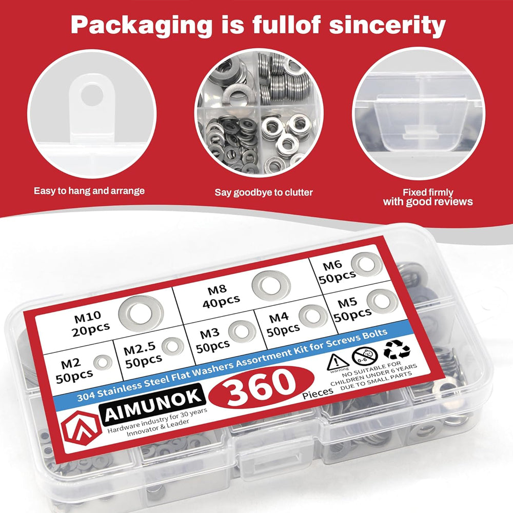 【Versatile Assortment】: Get the best combination with 360 pieces of 304 stainless steel flat washers in 8 sizes (M2, M2.5, M3, M4, M5, M6, M8, M10). Covering the 8 most common sizes for versatile applications.