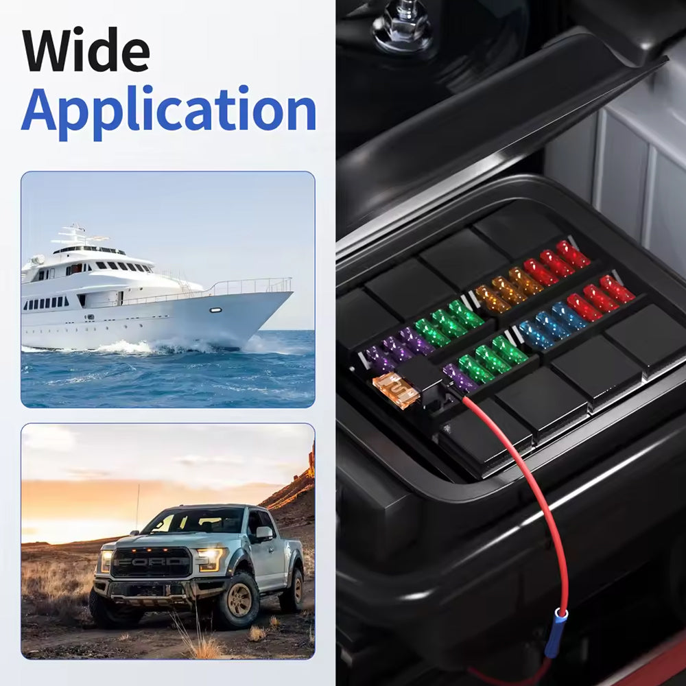 *【Wide Application】The auto fuse tap adapter is compatible with automotive, truck, RV, UTV, and boat applications. Moreover, it's suitable for various auxiliary equipment in automobiles, such as tachographs, fuse boxes, car alarms, GPS systems, LED lights, air purifiers, and more.