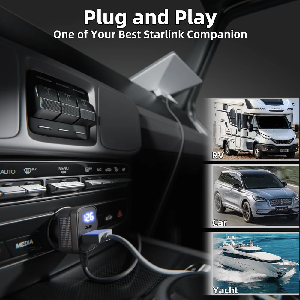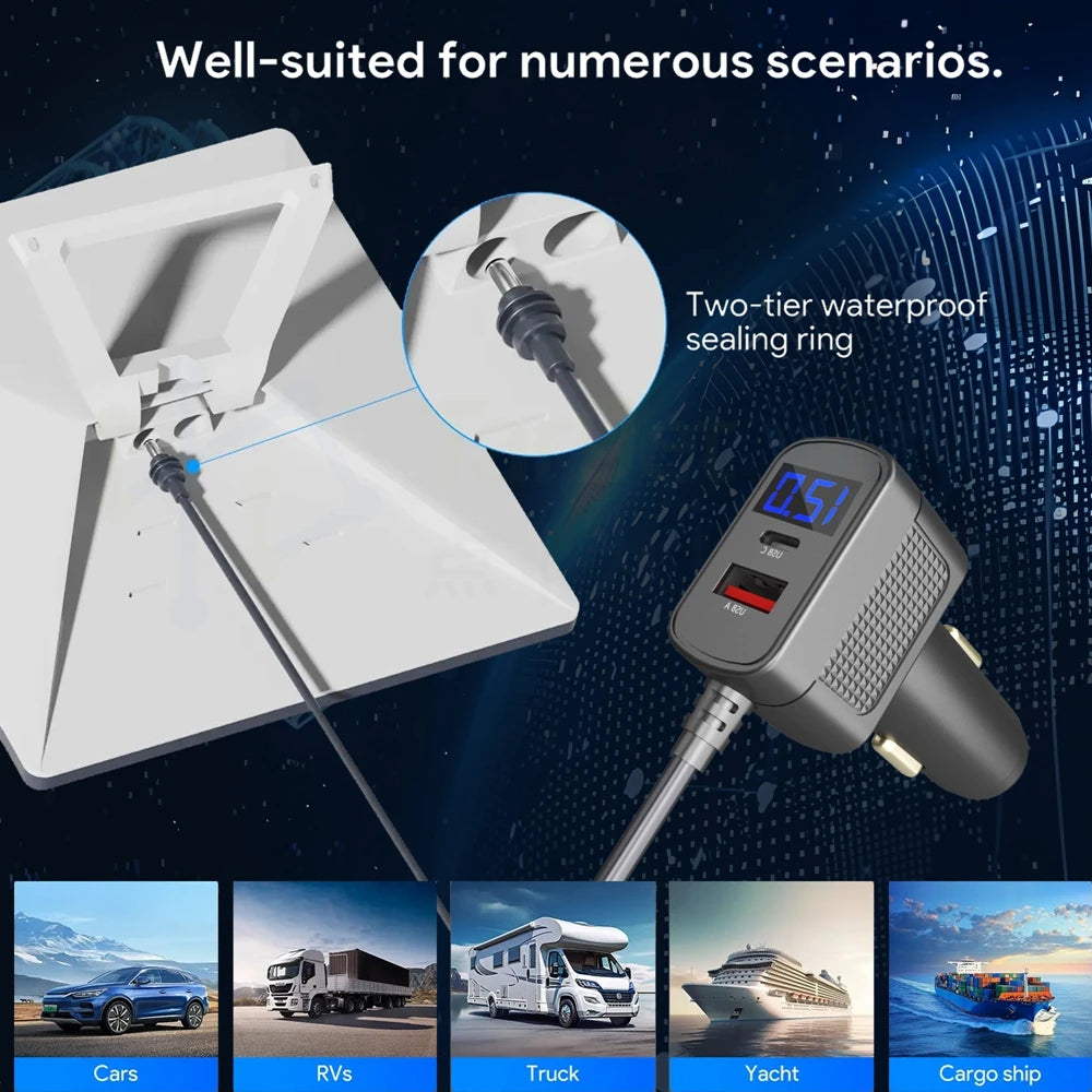 1. This multi-functional car charger provides a comprehensive power solution for star link mini. With a USB-A port, a USB-C port, and a dedicated 9.84FT (3M) DC output cable, you can simultaneously charge a variety of devices, including star link mini, smartphones, tablets, dashcams etc.