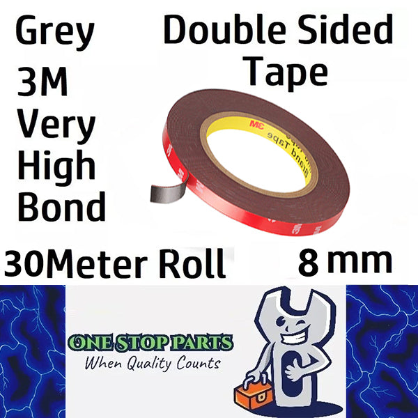 Here we have a new 30Meter roll of 8mm wide double sided tape, Grey in appearance and Very Strong.