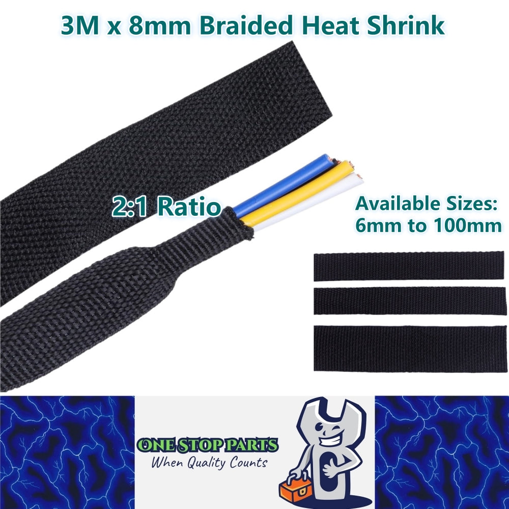 3M x 8mm 2:1 Black Heat Shrink Braided Sleeve Shrinks 8mm to 4mm Braided Sleeve