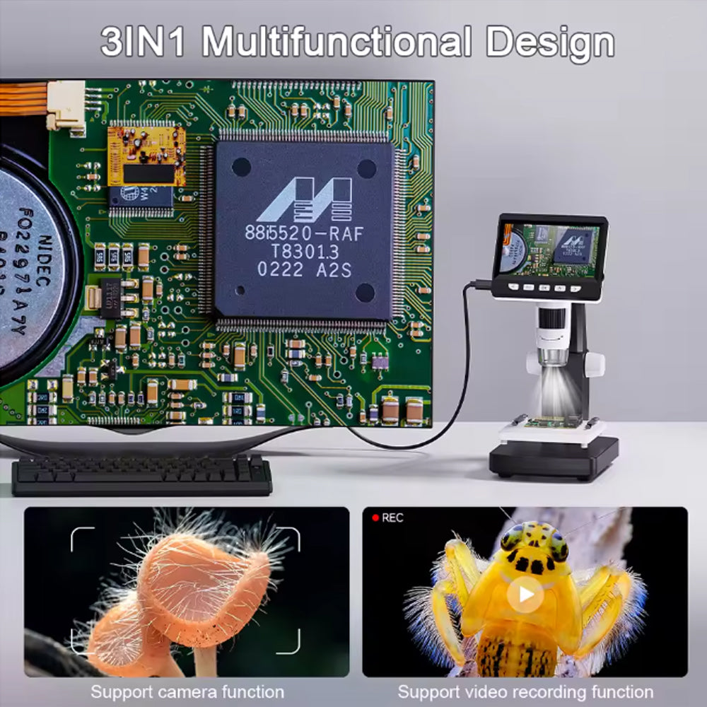 【IPS LCD Dispaly】This electron microscope is equipped with a 4.3-inch screen, and also has a 2-megapixel ultra-precise focus camera and 1080P high-definition imaging. You can directly observe the real-time clear image and high-quality video of the object, which is very convenient to use. Compared to eyepieces, the large screen lends itself to ergonomics and eliminates eye and neck strain.