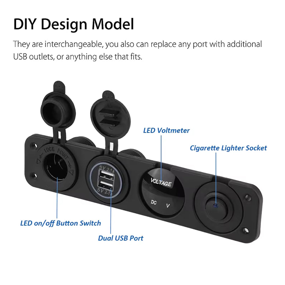 4 in1 Red LED Switch Panel 12V Dual USB Charger Voltmeter Power Socket with Wire