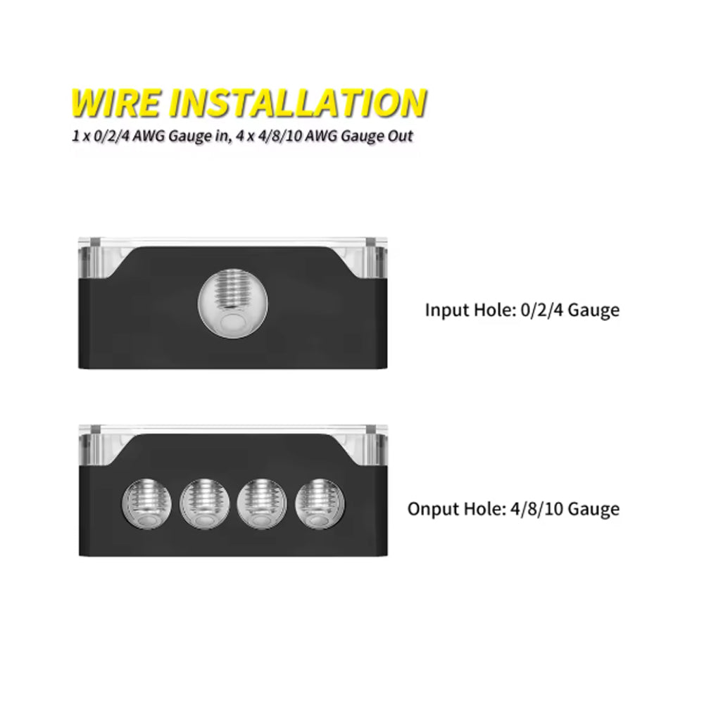 Adaptation : Input accepts 1/0 2/4 Gauge wire, Outputs accepts 4/8/10 Gauge wire.