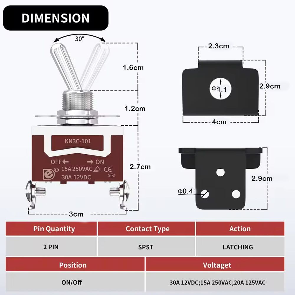【Heavy Duty】Heavy duty toggle switch rating is 30A 12VDC; 20A 125VAC; 15A 250VAC, 2-pole (2-wire contact connection).
