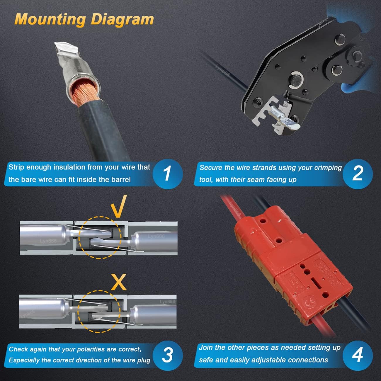 As pictured you will get 4 x 50amp connector and 8x pins which accept up to 6B&S, you can either crimp or solder the connections.