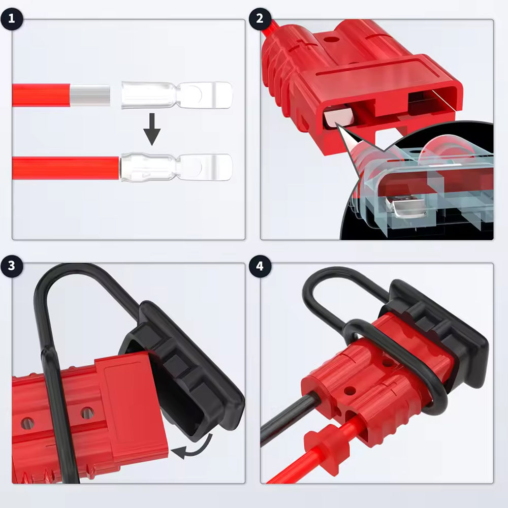 The battery quick connector plug kit is suitable for 6 gauge 8 gauge 10 gauge and 12 gauge AWG cable; Max voltage: 600V; Capacity: 50A.