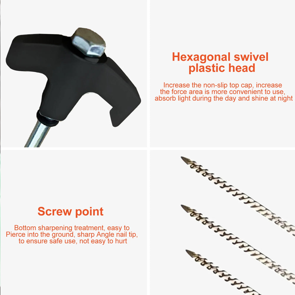 【Preium Material】 —The screw in tent stakes are made of high-quality iron and plastic, It has a threaded end for easy insert and superior grip when drilling into various hard surfaces. With their innovative screw-in design, these tent stakes offer hassle-free setup. Simply twist them into the ground using a drill or by hand, saving you time and effort during campsite assembly.
