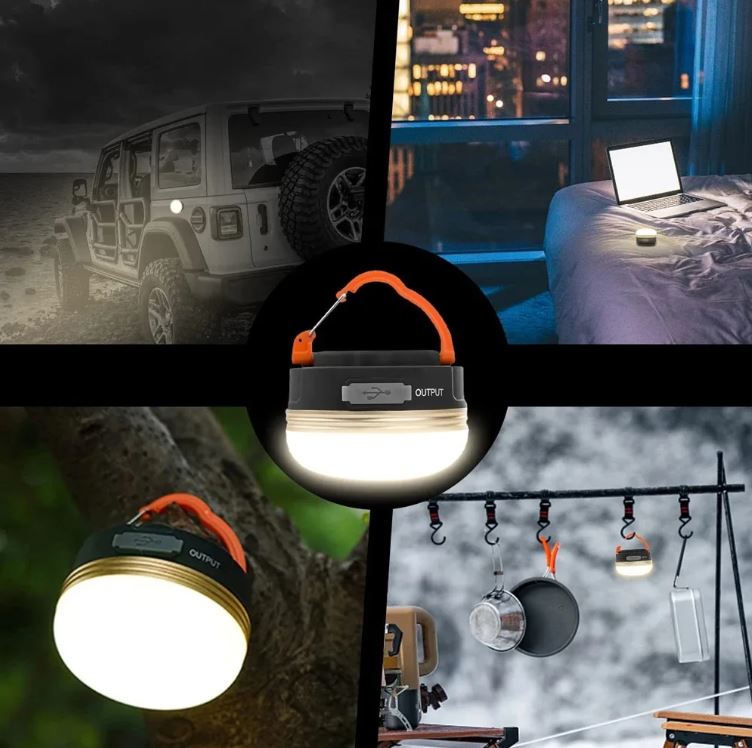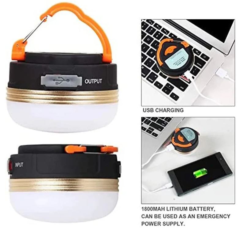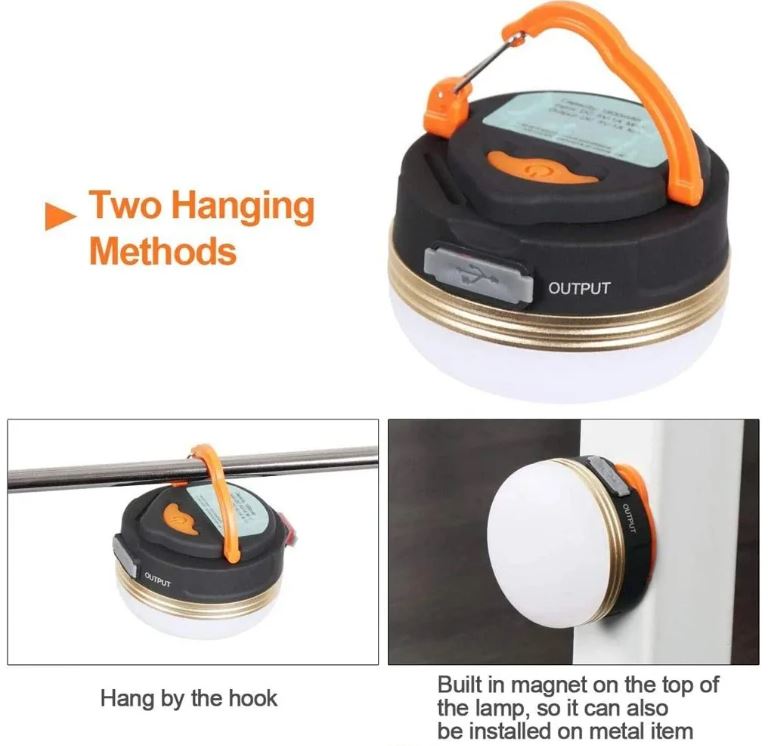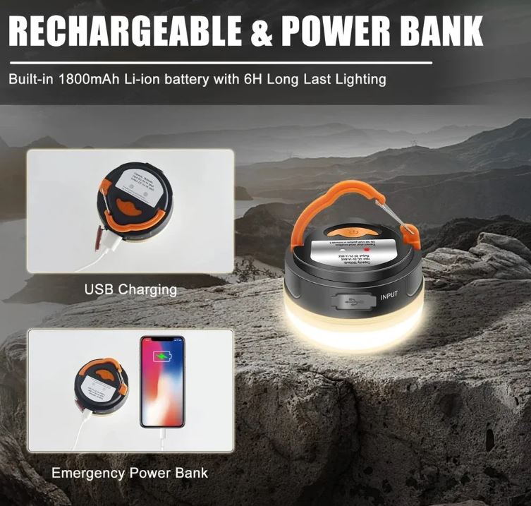 Built-in 1800mAh Li-ion rechargeable battery with USB Charging, not having to replace batteries. More than 6 hours of Lighting when fully charged. The camping light also can be used as a power bank for charging your phone in emergency.