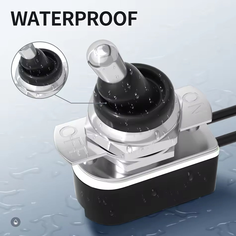 Heavy Duty: Waterproof toggle switch rated at 250V 3A; AC 125V 6A; DC 12V 10A, Spst 2 pin ON/OFF. Mechanical life in excess of 50,000 cycles; electrical life in excess of 20,000 cycles