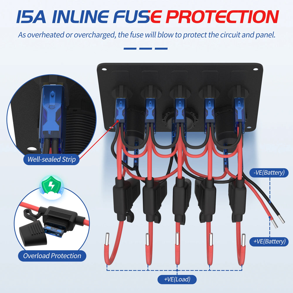 *【Wide Compatibility】 - The DC 12V-24V input outlet socket panel has various functions and wide adaptability. As for the 5-gang blue lighted rocker switches, can be used to control the headlamp, taillight, air refrigerator, heated blanket on marine, boats, yachts, RVs, cars, trucks, trailer, buses, jeeps, UTV, etc. The USB charger socket is suitable for mobile phones, tablets, MP3, DV, etc. Of course the cigarette lighter could be used to supply power for car vacuum cleaner, car navigation, car multifunction adapter, etc.