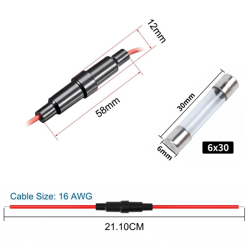 5 x Inline Glass Fuse Holders with 6mm x 30mm Long 0.5A Glass Fuses 16 AWG Wires