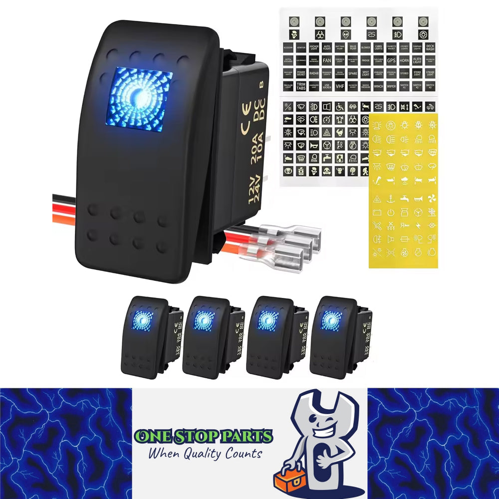 5 x Marine Boat LED Rocker Switch SPST 3 Pin ON/Off 12V 24V With Wires Stickers