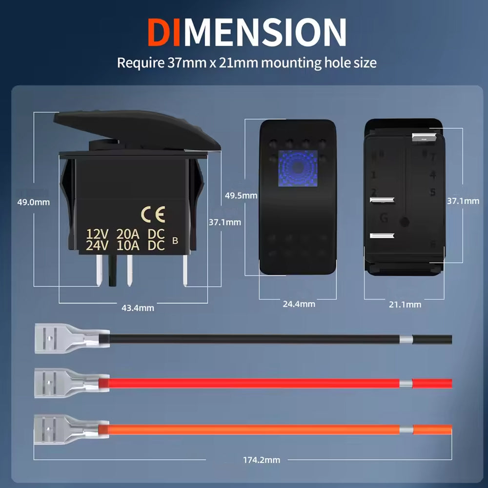 *Dimension: This marine switch required 37.2 mm x 21.2 mm mounting hole size. The snap-in mounting type make the installation of the boat switches become easy.