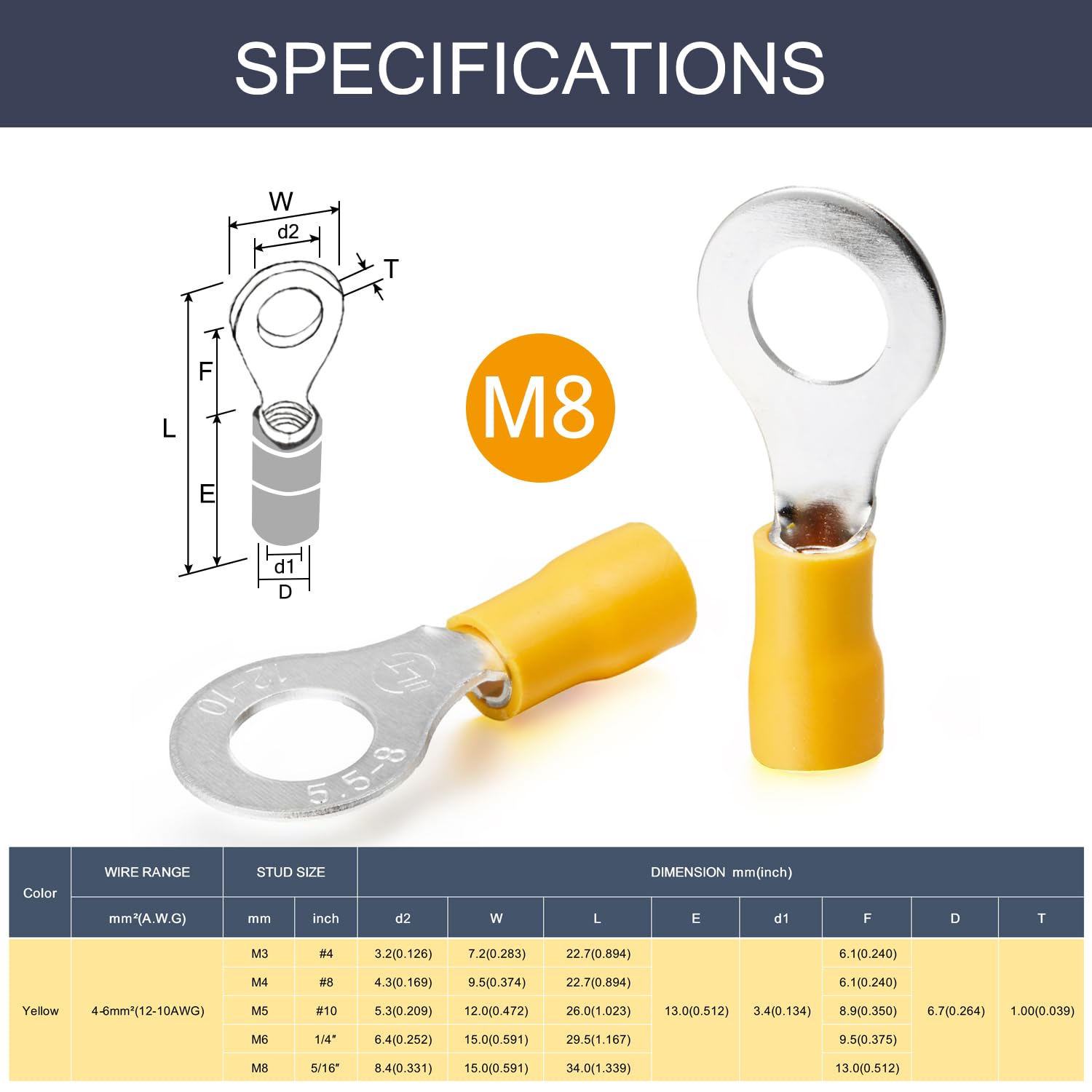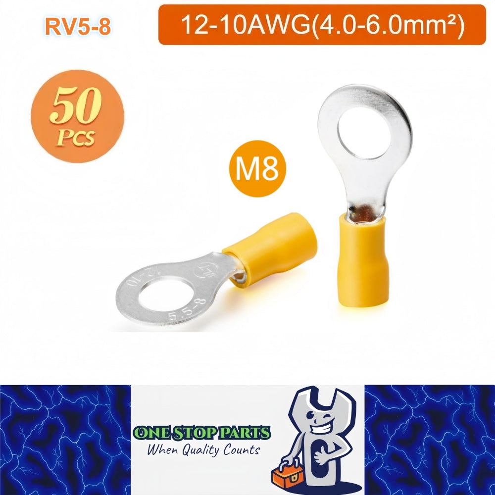 Here we have 50 x Yellow Ring Terminals M8 RV5-8 Ring Crimp Terminal 12-10AWG Wire Connector.