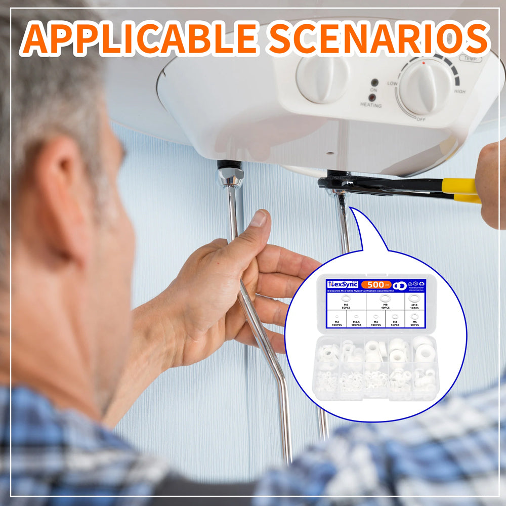 【Full size】It contains 500 Pieces / M2, M2.5, M3, M4, M5, M6, M8, M10 flat wahers. 8 different sizes of nylon flat spacer, can meeting your different needs.