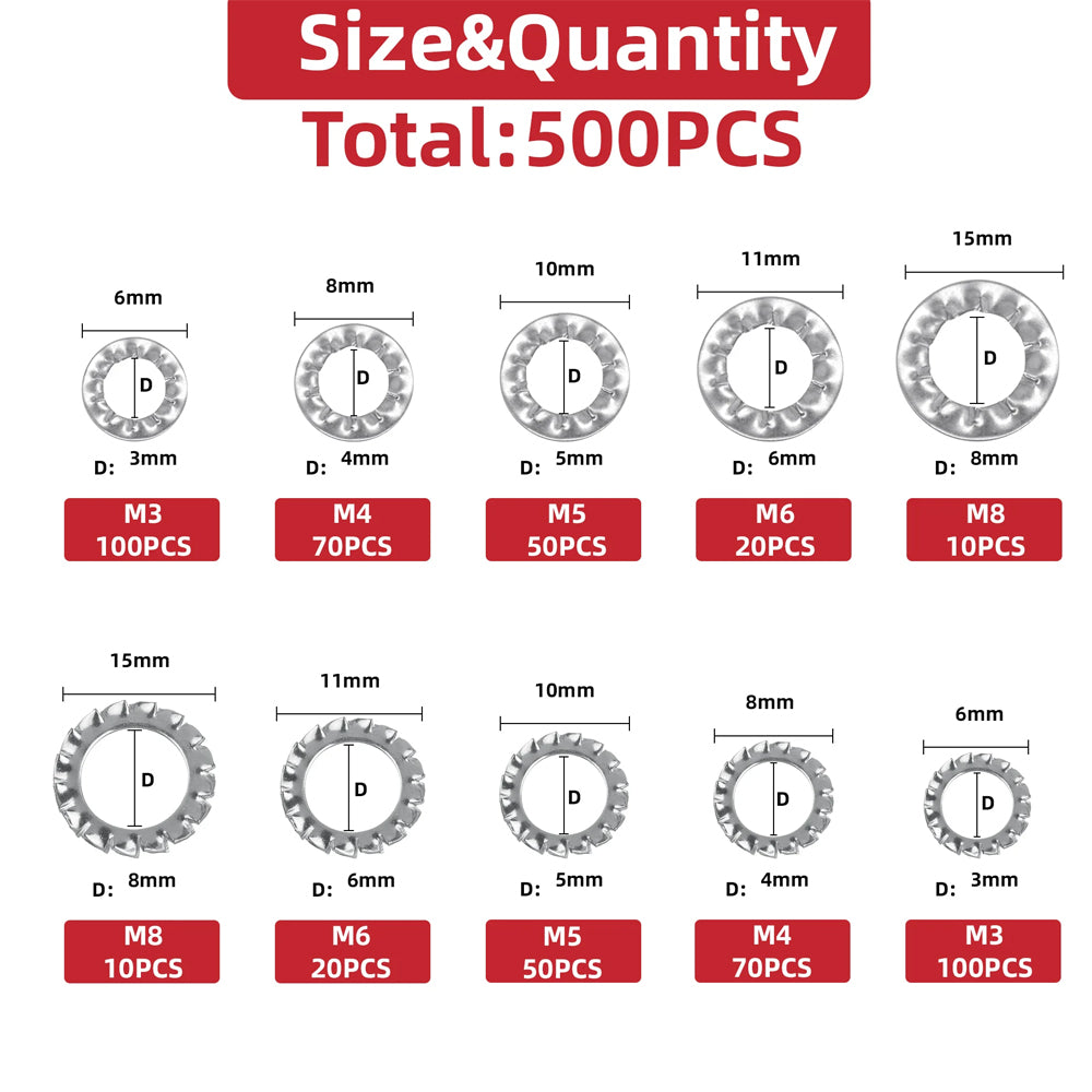 500pcs Serrated Lock Washer Set M3–M8 Stainless Steel Internal/External Kit