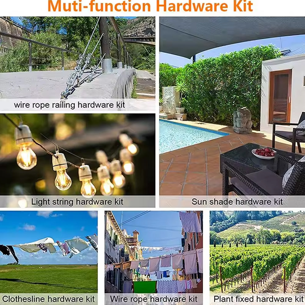 ▲【Hardware & Fittings】-- Include 50m/164ft PVC Coated Wire Rope, 5PCS M5 eye/Hook turnbuckle, 10PCS M2 Wire Rope Thimbles, 10PCS M5 Wire Eye Straps, 20pcs Aluminum Crimping Loop,20pcs Plastic expansion pipe.