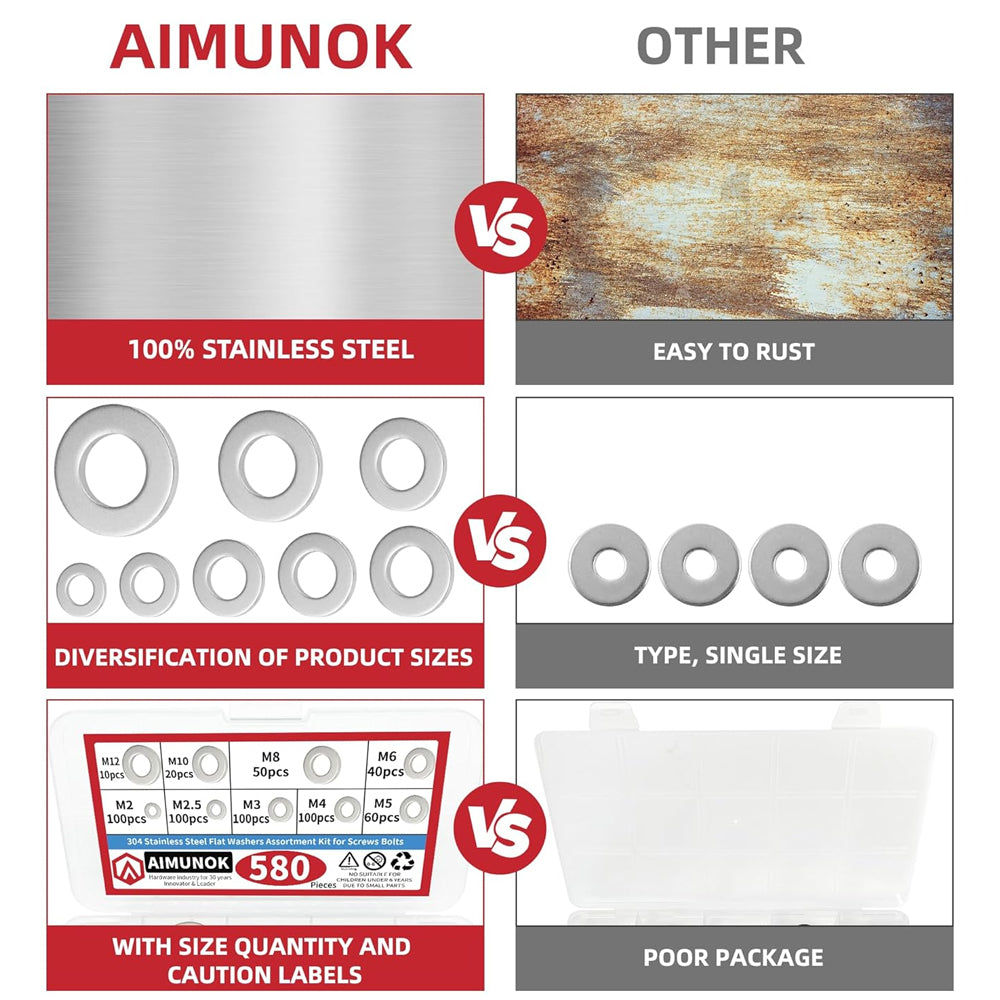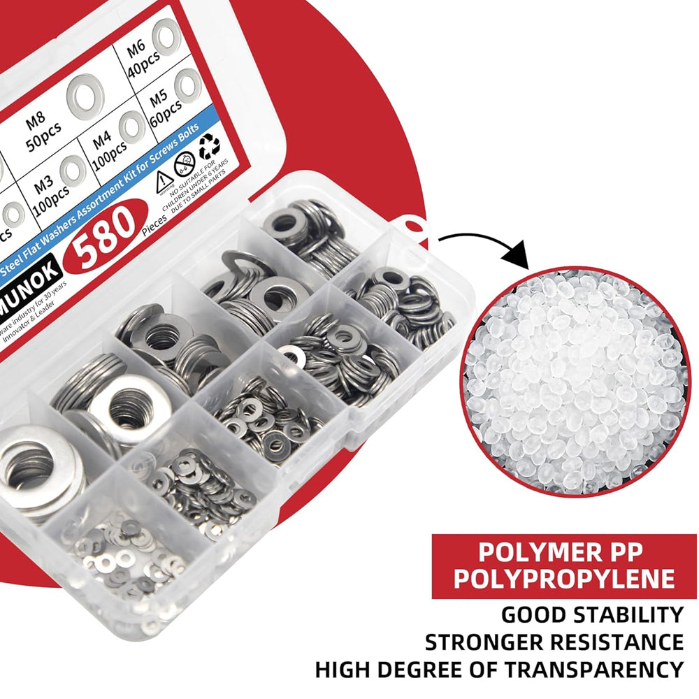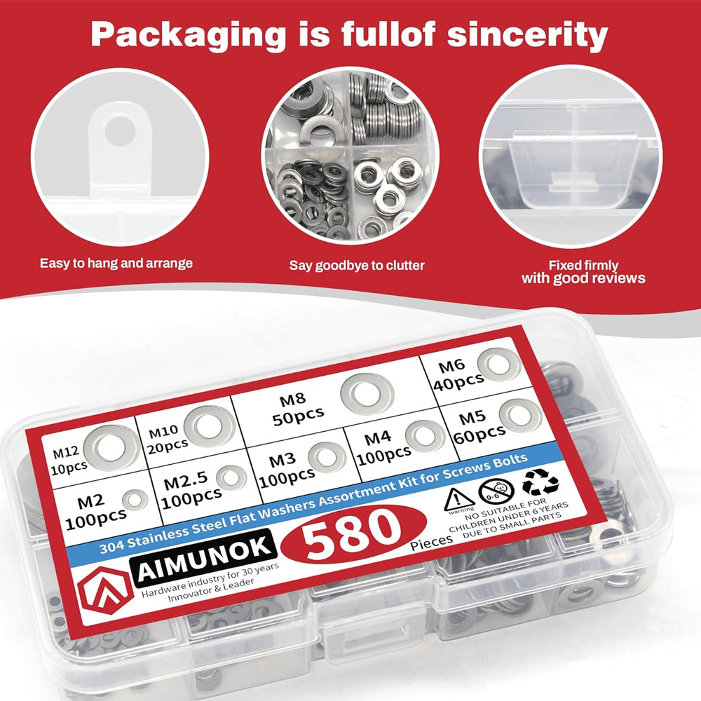【Versatile Assortment】: Get the best combination with 580 pieces of 304 stainless steel flat washers in 9 sizes (M2, M2.5, M3, M4, M5, M6, M8, M10, M12). Covering the 9 most common sizes for versatile applications.