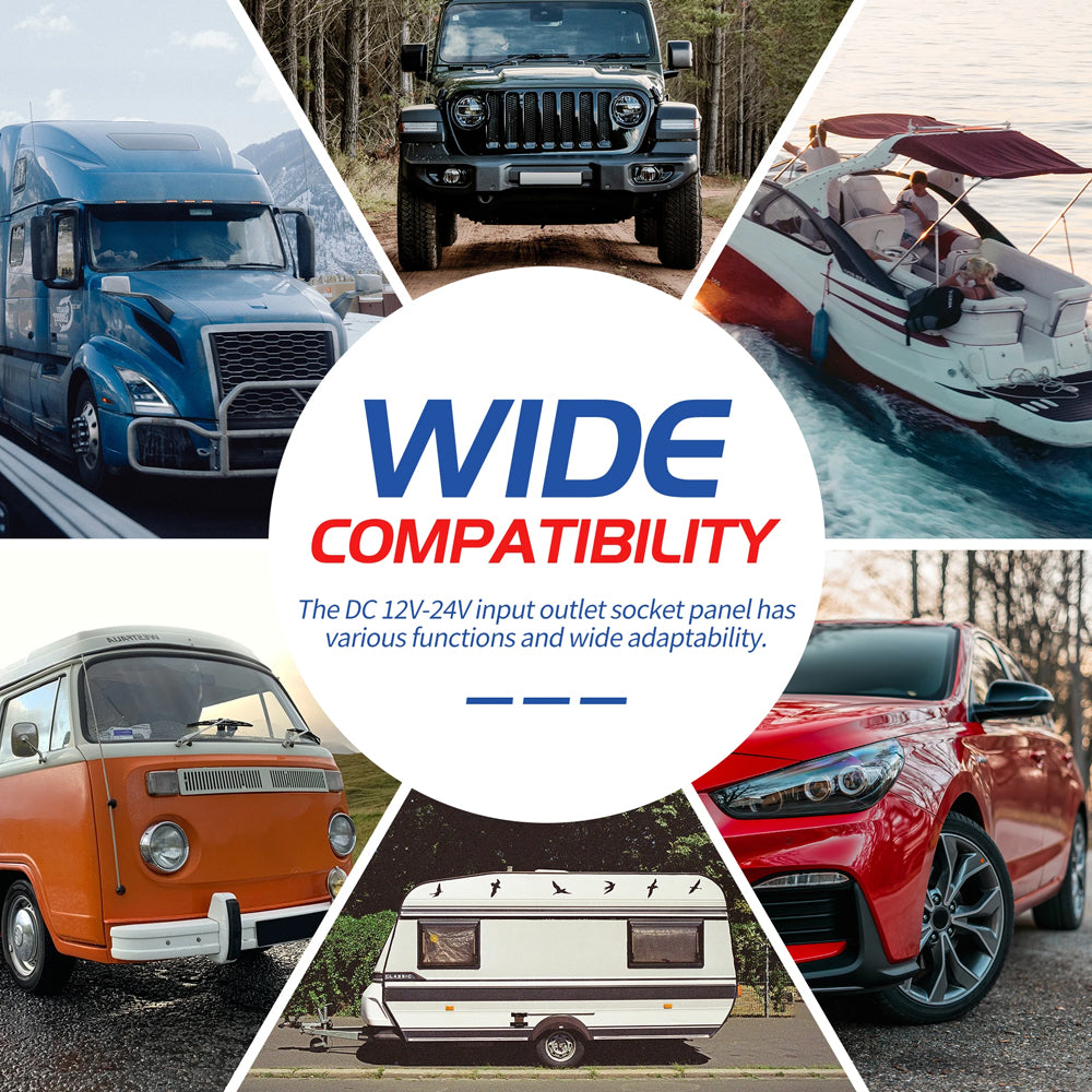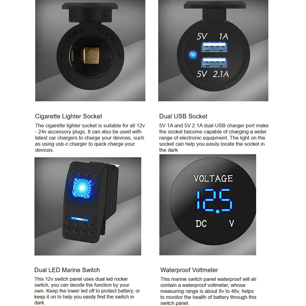 *【Wide Compatibility】 - The DC 12V-24V input outlet socket panel has various functions and wide adaptability. As for the 5-gang blue lighted rocker switches, can be used to control the headlamp, taillight, air refrigerator, heated blanket on marine, boats, yachts, RVs, cars, trucks, trailer, buses, jeeps, UTV, etc. The USB charger socket is suitable for mobile phones, tablets, MP3, DV, etc. Of course the cigarette lighter could be used to supply power for car vacuum cleaner, car navigation, car multifunction adapter, etc.