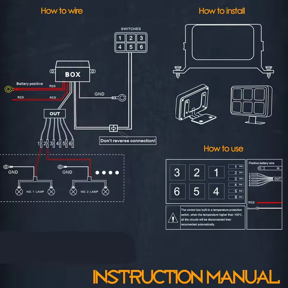 BOX COME WITH - 6 gang switch panel, control box, 50pcs stickers, long and durable nylon wiring harness, 6 color coded output wires for hooking up accessories, 6 plug-in style 40A relays, 1 ATO style 30A and 5 20A fuses for protection. Accessories included panel bracket, 3M tape, REPLACEABLE butt splice crimp connectors, wire splice connector, zip ties, screws, manual (accessories are at the bottom of the foam pad).