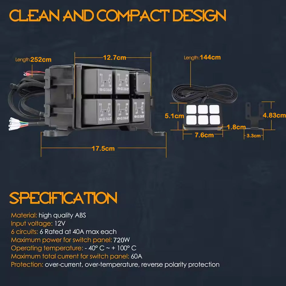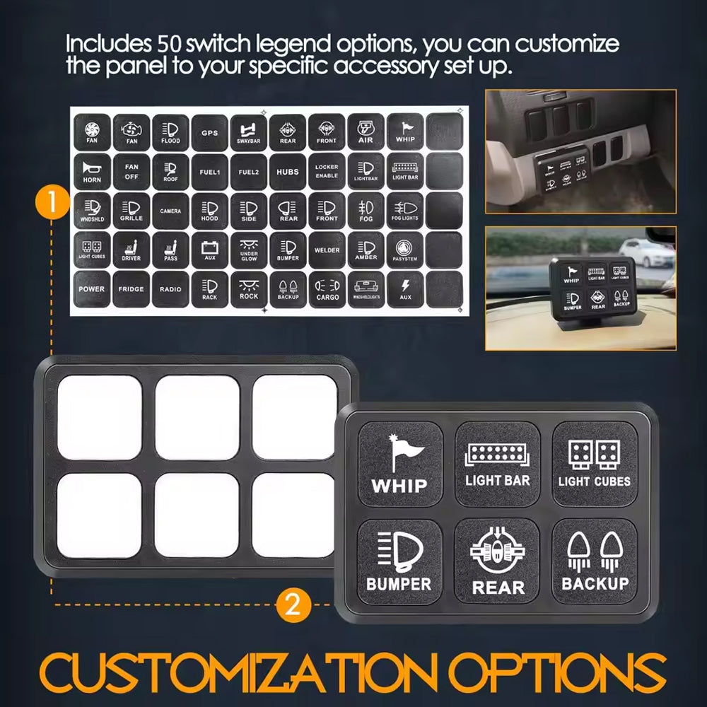 OVERVIEW - The 6 Gang Switch Panel allows you to control 6 set of LED lights or devices with the push of a button. Come with 6 circuits rated at 40A each, can powered all types of 12V accessories. Includes 50 reusable stickers, you can customize the panel to specific accessory set up. With high stability, anti-interference and strong anti-vibration ability. With the memory function.
