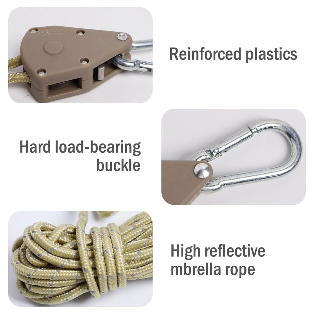 * Safety Design: Each rope ratchet has a woven reflective thread. Under the illumination of objects such as moonlight and flashlights, the ropes ratchet can be clearly visible even in the dark to protect people from tripping at night.