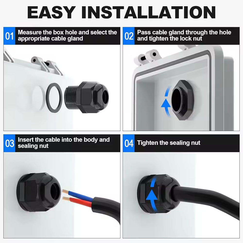 Each strain relief cord connector comes with a rubber washer. The rubber washer can effectively prevent water, rain, UV, wind, and dust, ensuring the normal operation of electrical equipment.