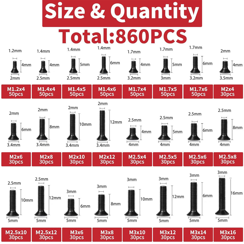 ✔【ITEM SIZE】: The electronic repair kit includes 860 pieces screws, 24 sizes to meet your different needs, easy to use in multiple scenarios, dimensions include M1.2 M1.4 M1.7 M2 M2.5 M3. Especially M.2 screws, which are often needed in daily life.