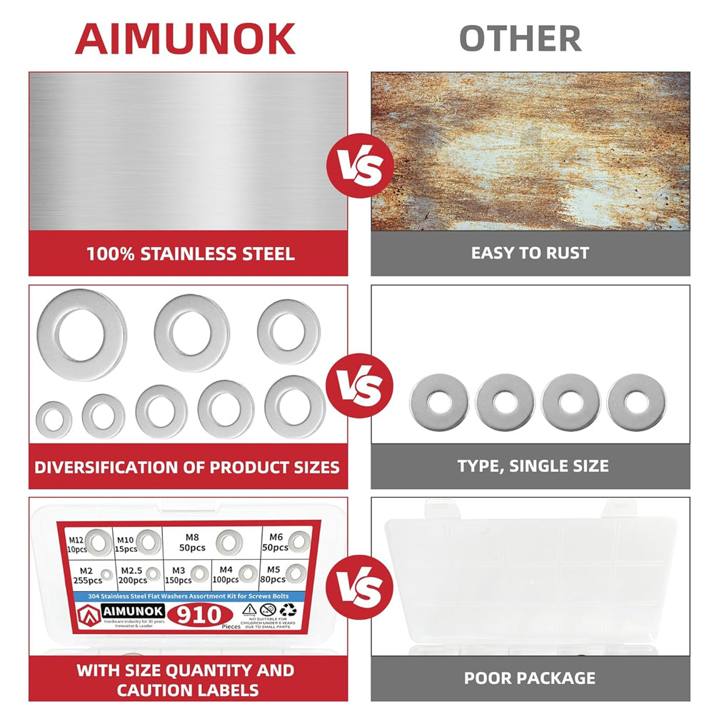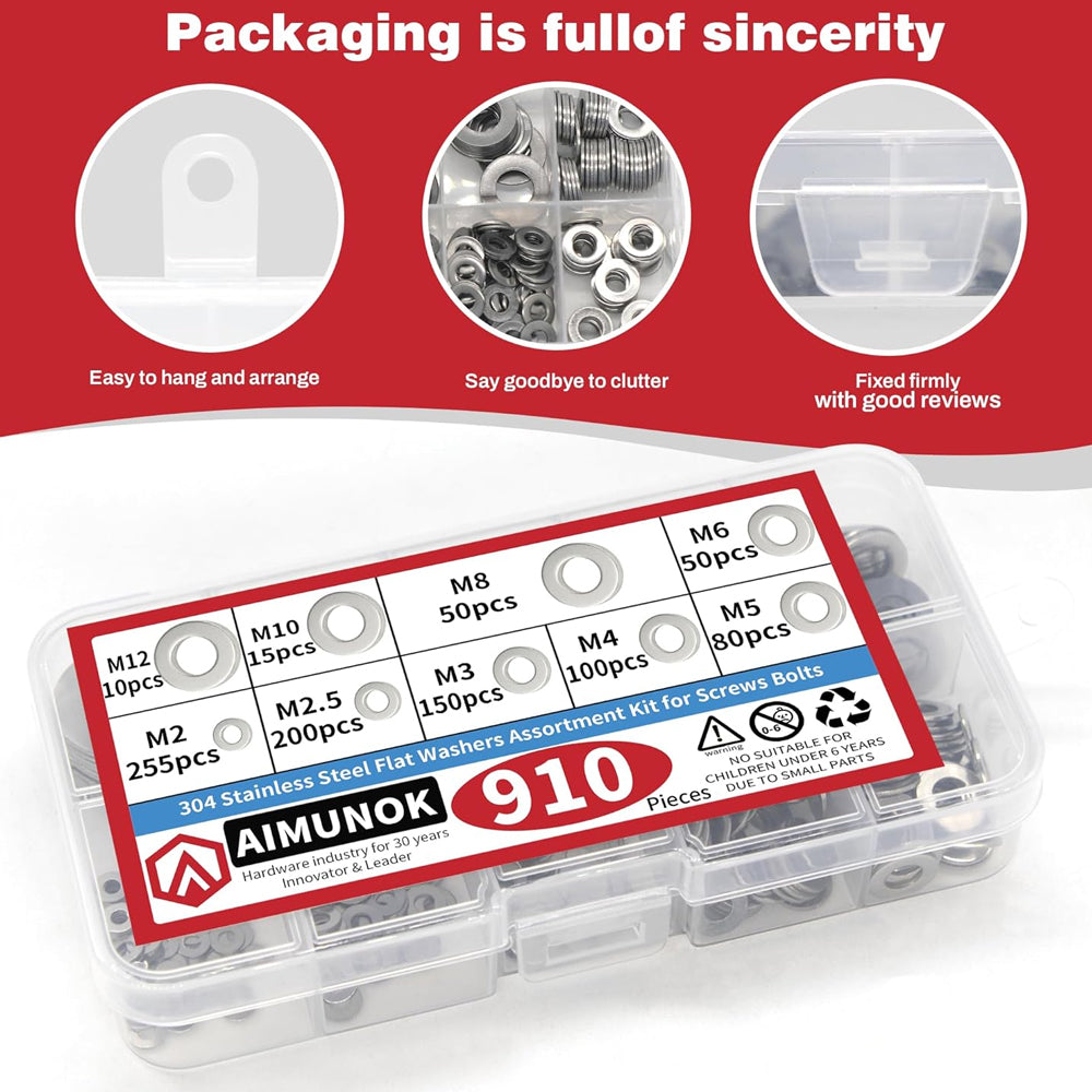 【Versatile Assortment】: Get the best combination with 910 pieces of 304 stainless steel flat washers in 9 sizes (M2, M2.5, M3, M4, M5, M6, M8, M10, M12). Covering the 9 most common sizes for versatile applications.