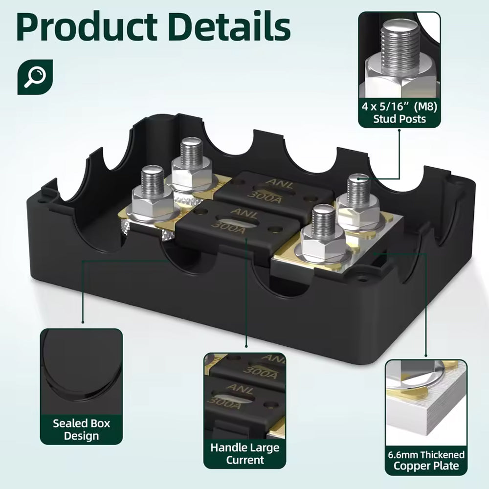 5/16" Studs: This ANL fuse block kit with 4 x 5/16"(M8) stud posts, which makes it be able to accept large size terminal connectors and wires. The size of the connector can be selected, which is more convenient