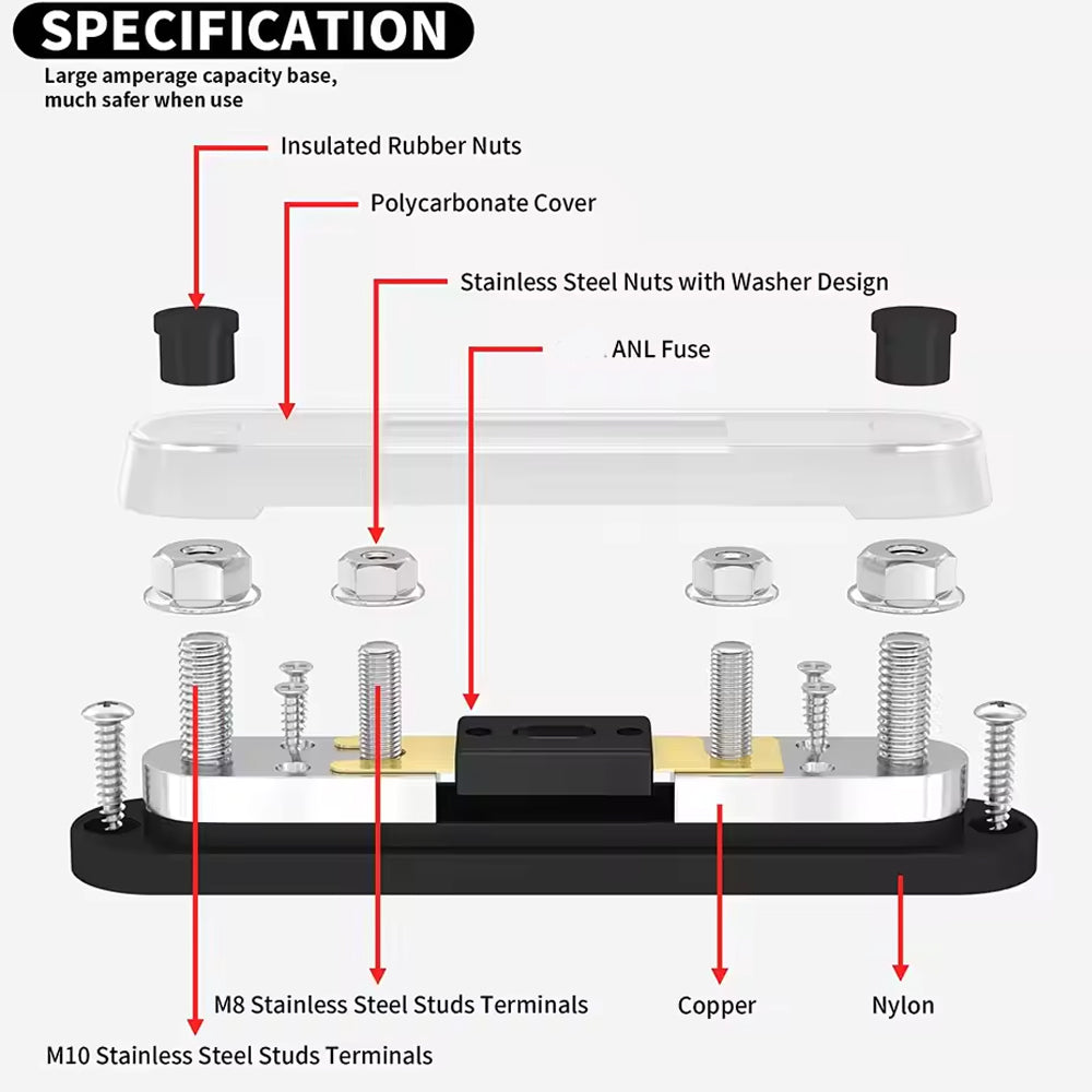 -The outer terminals are M10 studs and the center two terminals for ANL fuse are M8 studs, you can choose according to your needs.