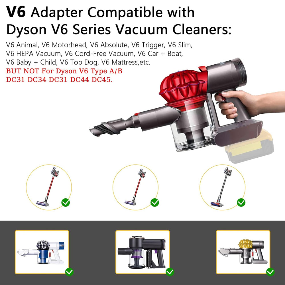 Our DW20V6 Adapter is Compatible with Dyson V6 Cordless Stick and Handheld Vacuum Cleaner Models: V6 SV03 SV04 SV05 SV06 SV07 SV09, DC59 DC58 DC61 DC62 DC72 DC74, V6 Animal, V6 Motorhead, V6 Absolute, V6 Trigger, V6 Slim, V6 HEPA Vacuum, V6 Cord-Free Vacuum, V6 Car + Boat, V6 Baby + Child, V6 Top Dog, V6 Mattress, and V6 Fluffy Cordless Vacuum Cleaner. (âś– NOTE: ONLY for V6 series vacuums, NOT for V7 V8 V10 V11 DC31 âś–)