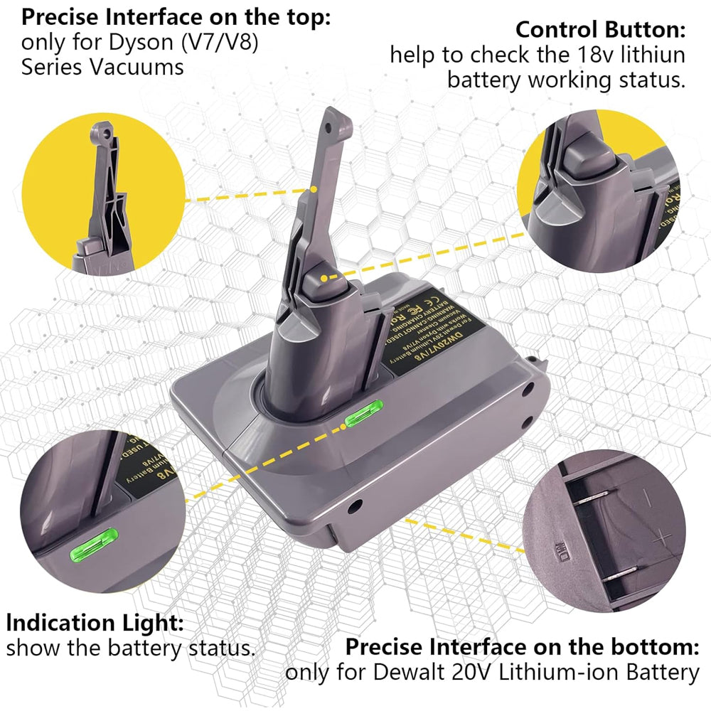 đăExcellent Compatibilityă Battery Adapter Compatible with DeWalt 18V/20V/60V lithium ion batteries, the DW20 V7/ V8 battery converter's upper interface works with Dyson V7 and V8 Series Vacuum Cleaners, such as V7 Motorhead, V7 Fluffy, V7 Animal Pro+, V7 Trigger, V7 Trigger, V7 HEPA, V7 Car+boat, V7 Absolute..V8 Animal, V8 Absolute, V8 Fluffy, V8 Motorhead, V8 Carbon Fiber, V8 Slim, etc. Work for Dyson V7 and V8 animal vacuum series and handheld Vacuum Cleaner.
