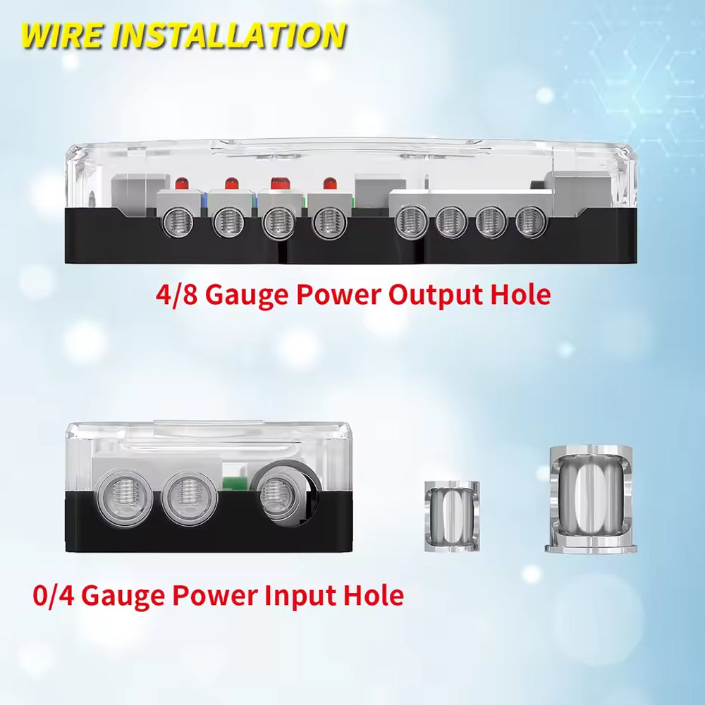 ★ Ferrule ★ - The power distribution block car audio will come with ferrules to expand its capacity. As for input hole, it allows 0, 2, 4 gauge wires installation, and as for output hole, it allows 4, 6, 8 gauge wires installation.