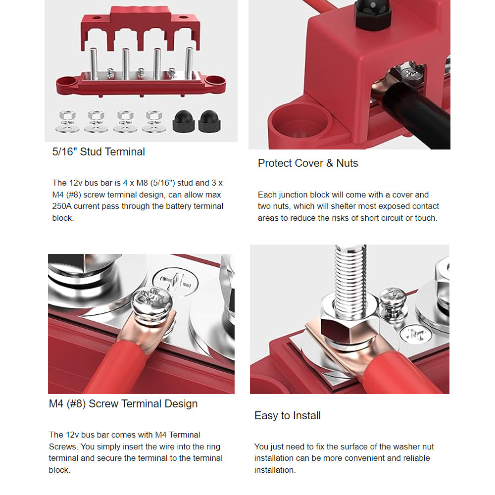 ★ 5/16" Stud Terminal ★ - The battery bus bar terminal block includes 4 x 5/16" studs terminal and 3 x #8 screw terminals, which makes the 12V junction block able to accept large size terminal connectors and wires.
