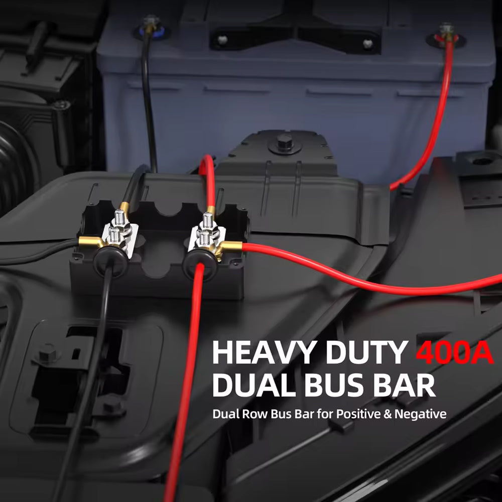 Dual Bus Bar: Positive and Negative(Ground) 2 in 1 Bus Bar makes your wiring more neat and more save your wiring space. The 400A bus bar terminal block features 6mm(1/4") thicker copper bus bar plate with stainless steel studs and nuts