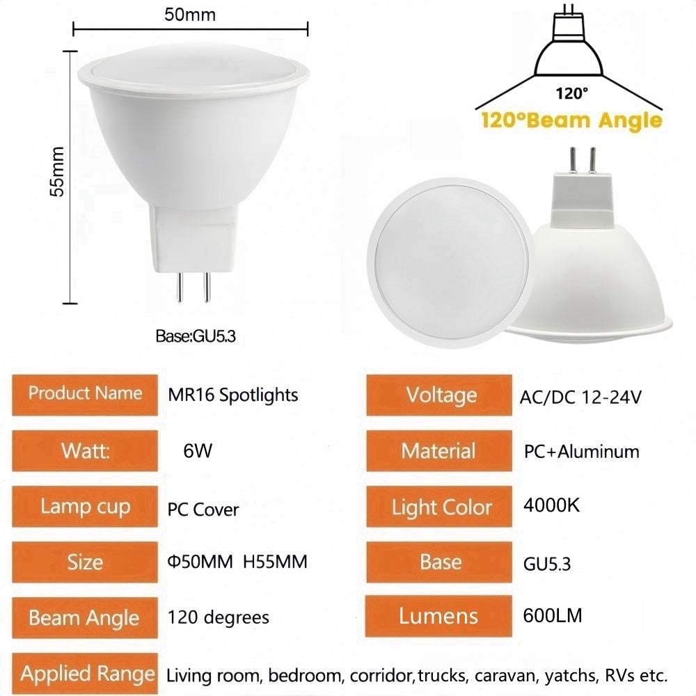 MR16 6W LED Spotlight AC/DC 12V-24V 120 Degree 4000K Daylight White Downlight