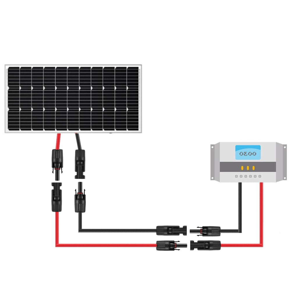 *Extension Design: The extension cable with Connectors runs between the solar panel and charge controller or between two solar panels, allowing for greater space between both items. The wiring is weatherproof and designed to withstand extreme heat and cold.