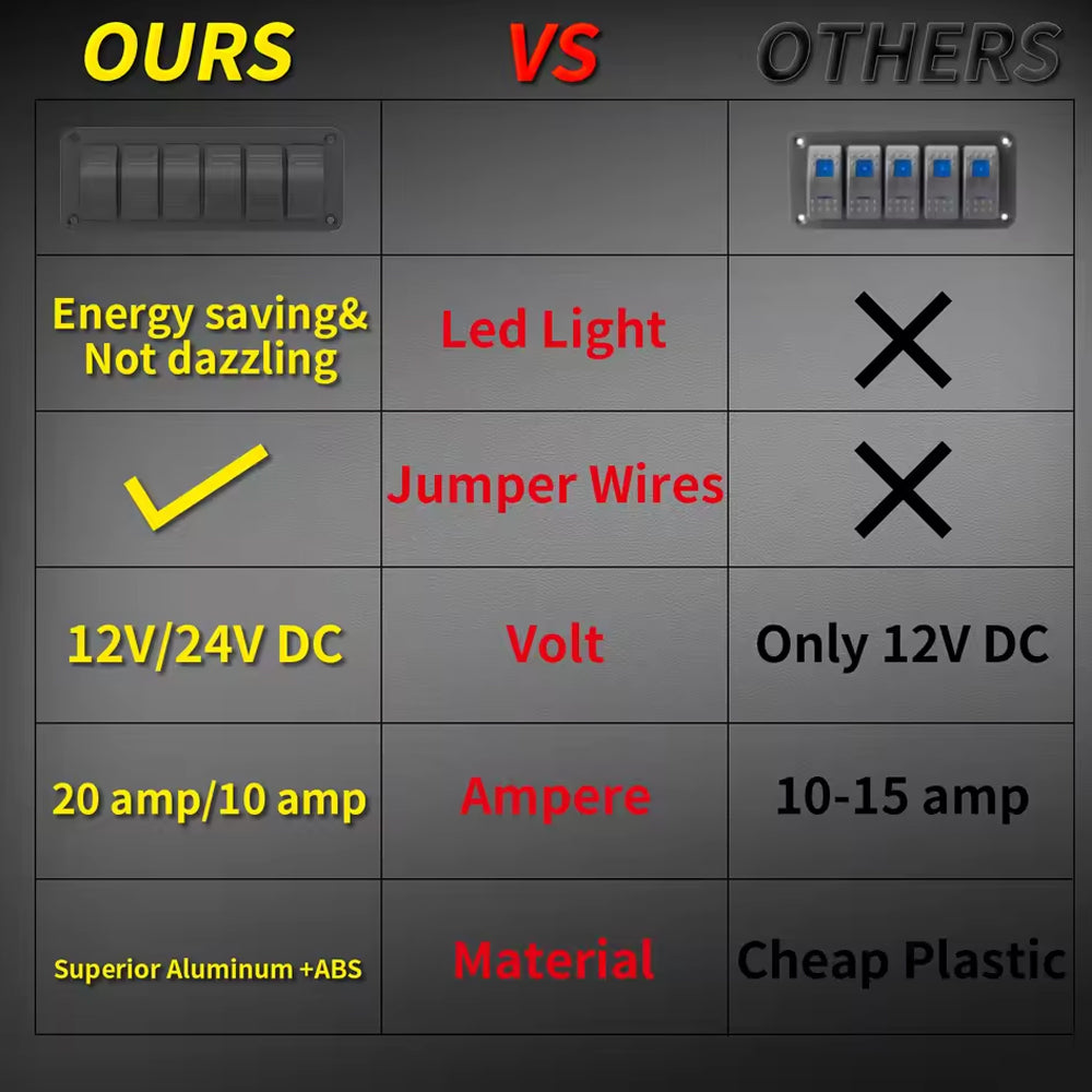 The 6 gang rocker switch panel features a unique 1 LED light design, compared with other dual LED light design, more energy saving and much less dazzling.