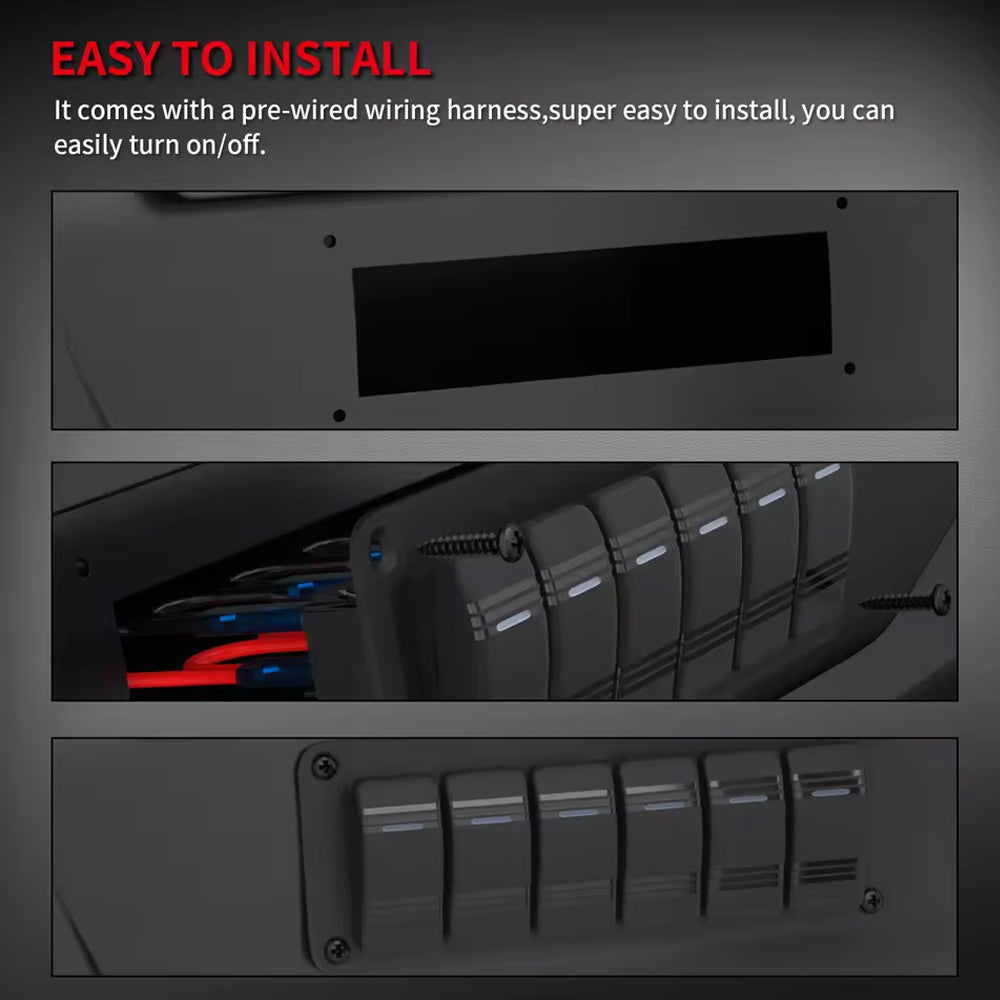 Rocker switch panel with pre-wired wiring harness for you to easily install in both 12V and 24V vehicle, yacht, ship, caravan, truck, etc.