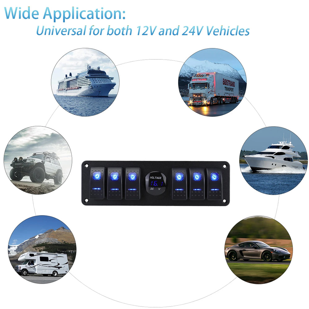 Multi-Function designed: This switch panel is integrated with 6 Rocker switches. Rated at 12VDC 20amps and a LED voltmeter. Suitable for most 12V-24V DC cars, UTVs/ATVs, trucks, trailers, RVs, caravans, buses, marine boats, yachts etc.